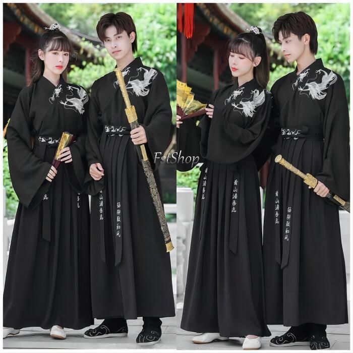 漢服カップルペア男女通用コスプレ服 舞台ステージダンス衣装 唐装2点セットアップ演出服メンズ男女兼用レディース古代コスプレ衣装 大人用 長袖 交差襟コスプレ衣装トップス袴風スカート羽織パーティー中華服 上下セット仮装 団体服イベント男性 剣士 カンフー文化祭 学園祭