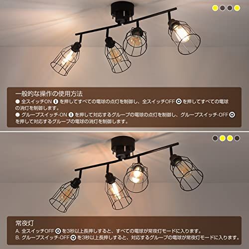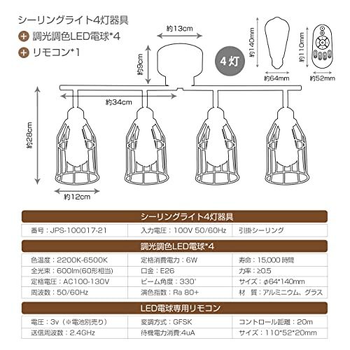 【商品情報】使用電球数:4個 口金:E26 6W省エネ(60W形相当) 全光束::600LM(調光可能) 色温度:2200-6500K(調色可能)Ra80 ビーム角度:330 パッケージ:器具*1調光調色電球*4リモコン*1注意:物流の安全を保証するため、リモコンには電池は入っておりません。