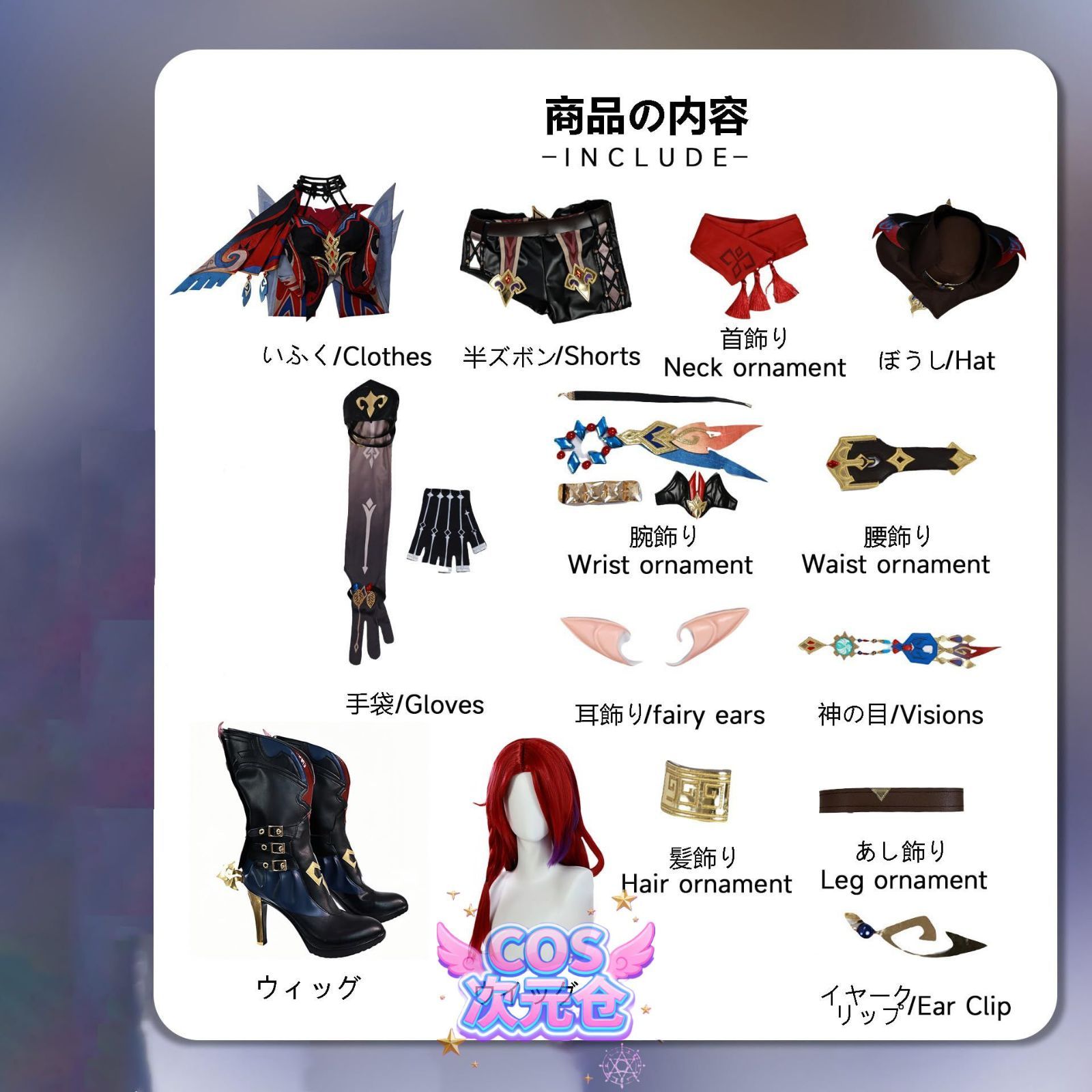 当店のコスプレ衣装につきましては、一部の商品リンクにはウィッグや靴が含まれている場合がありますが、一部の商品リンクの価格にはウィッグ、靴、または武器が含まれていない場合もございます。