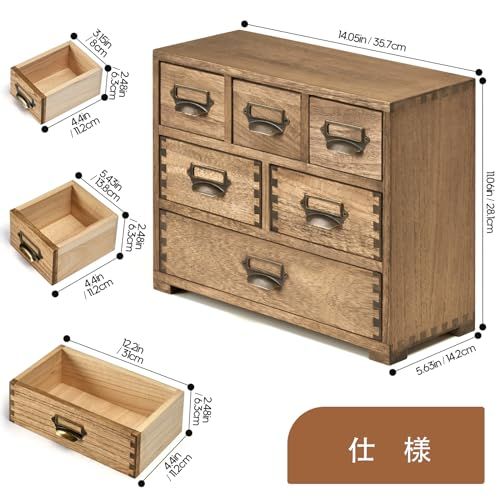 特徴3:【仕様】ミニチェストサイズ:幅35.7*奥行14.2*高さ28.1、本体重量は2.5kg、品質表示:本体は天然無垢桐材、裏板と引出の底板は桐化粧板