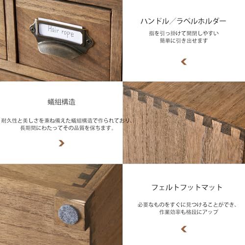 特徴2:【懐かしいデザイン】古民家にあるような薬箪笥風の引き出しつきチェストである。アンティーク風の、ラベル入れつき取っ手金具が恰好良い。置いて恰好よく、使って便利。 オシャレな空間作りに最適です。
