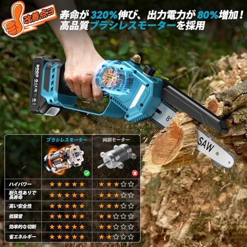 【ブラシレスモーターの優位性】一般的な電動ノコギリはブラシ付きモーターを使うことが多いですが、弊社製品は革新的なブラシレスモーターを採用!その利点はたくさんあります。? 安全性抜群:火花や煙が出ないので、安全に使えます。?長寿命:ブラシ交換不要で、耐久性が高く、安定した性能を維持します。? 省エネ高出力:エネルギー消費が少なく、1 つのバッテリーでも長時間使えます。?作業性能安定:振動が少なく、作業効率と精度が高まります 。