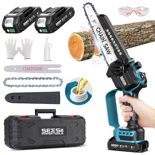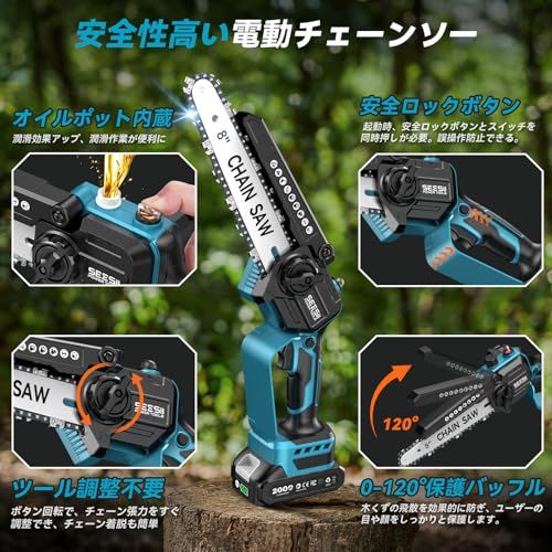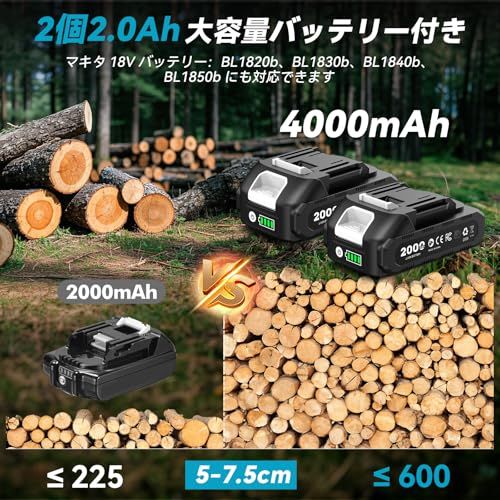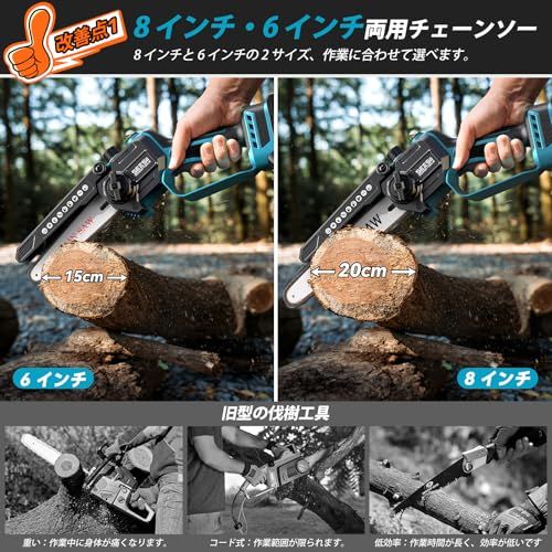 ご注:長時間の連続使用はお控えください。20 分以内の連続使用をお勧めします。モーターが過熱していることに気づいた場合は、直ちに使用を停止し、温度が下がるまで放置した上で再使用してください。【6、8インチ両用コードレスチェーンソー】本体重量はわずか 1kg!2 セットのガイドバーとソーチェーン(6 インチ8 インチ)を搭載し、強力な切断性能を発揮し、切断径は 1520cm にも達します!大容量 2000mAh バッテリーを 2 つ装備し、残量表示機能付きで、しかも マキタの18V バッテリーと互換性があります。バッテリーの満充電時間は約 2.5 時間となります。電源コードが不要なため、屋外作業には抜群の便利さを提供します。家庭の DIY プロジェクトから樹木の伐採まで、あらゆる作業に対応できる万能ツールです。さらに専用の収納ケース付きで、軽量設計のため持ち運びも大変簡単です。