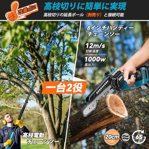 チェーンソー 充電式 ブラシレス 8インチ-6インチ両用 高枝切りの延長ポールと接続 なたかえだ 電動 ハンディソー 2個21V 2.0Ah大容量バッテリー搭載 給油 工具レスチェーン調整 コードレス 強力 片手 軽量 木工切断 4b8a46cd