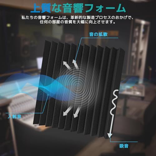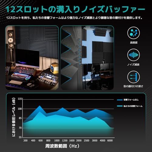 高性能吸音材壁: 独特設計の吸音パネルは、音を吸収することによって騒音を軽減します。12個の精密カット面が音波を多方向に吸収・散乱させ、表面接触を最小限に抑え的同?、室内の音響効果をコントロールします。楽器室、録音室、コントロールルーム、放送局などへの設置が理想的です。高密度ウレタンフォーム製の吸音材壁は、エコーや不要な背景ノイズを大幅に軽減し、よりクリーンで集中力のある音環境を創造します。