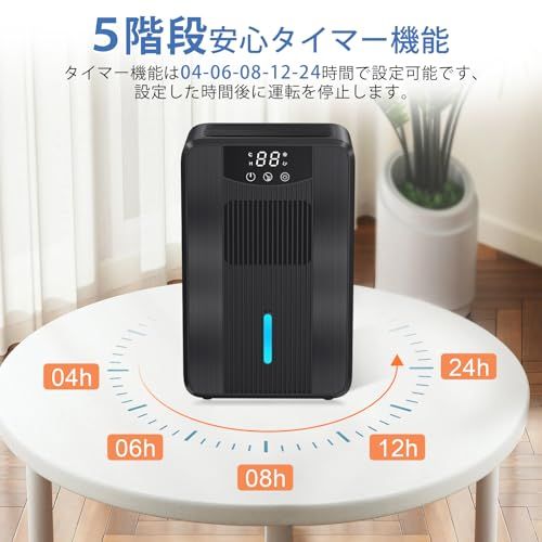 【5階段安心タイマーを付き】タイマーは4・6・8・12・24時間に設定することができます、設定した時間後に運転を停止します、就寝や外出の際にも重宝に使用可能です、無駄な電気代の心配がない。ナイトモードで、除湿機の操作音はわずか40dB、寝室や子供部屋に置いてもほとんど気にすることもなく快適に眠ることができます。デジタル画面が消灯し、就寝時の気になる光を軽減、風量の弱設定を自動で行います。