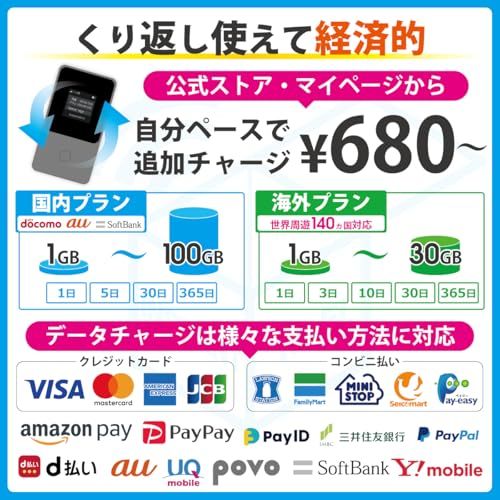 【1GB/1日から選べるオトクな料金設計でギガチャージに対応しているから繰り返し利用できます!】 インスタントWi-Fiの追加データプランは1GB100GB、利用期間は1日365日から選べるから、利用シーンに合わせて様々なプランをお得に追加いただけます! マイページからなら24時間365日いつでもチャージ可能です!
