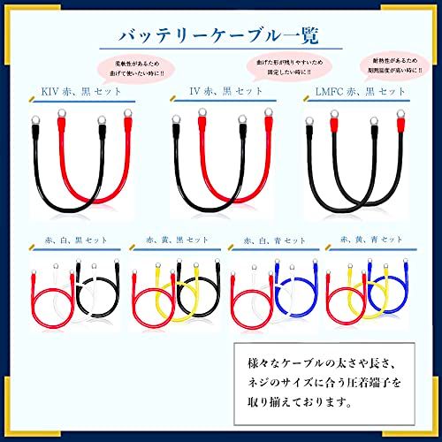 【購入方法】色セット本数:赤黒セット・赤2本セット・黒2本セット・赤1本・黒1本からご選択可、 長さ:0.3m5mからご選択可、 圧着端子サイズ:R38-S5S10・R38-512からご選択可(ネジ穴サイズに合わせてご選択ください。) ご使用用途に合わせて選択いただけるように様々なサイズをご用意しております。