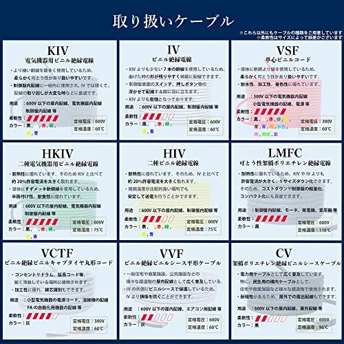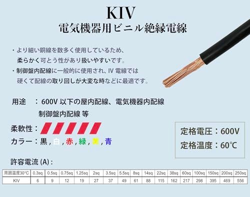 【仕様】電線:KIV サイズ:38sq 定格電圧:600V 定格温度:60 許容電流:162A 芯線面積:38m 導体外形:8.8mm 被覆厚:1.8mm 電線外形:12.4mm 耐電圧:2500V/1min.