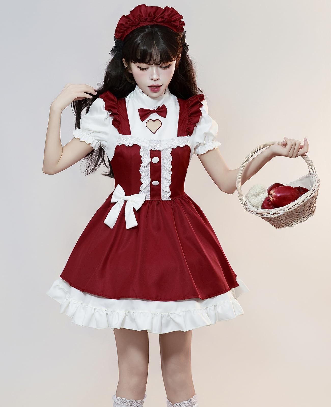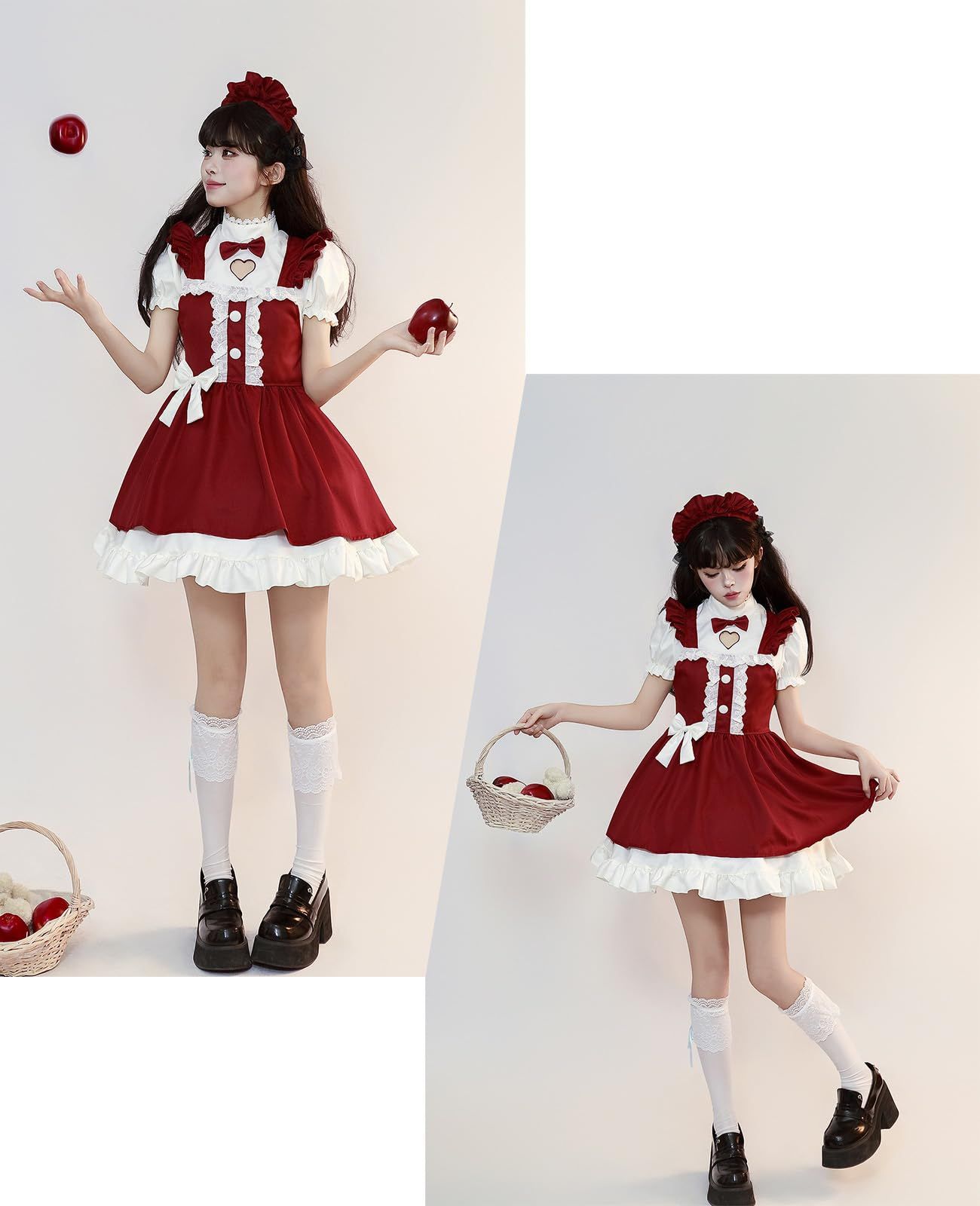 【タイプ 1】:クリスマスらしいファンタジー風。赤いドレスに白いフリルが効果的で、マントをまとうとまるで魔法の世界から来たようで、幻想的な雰囲気が満点です。