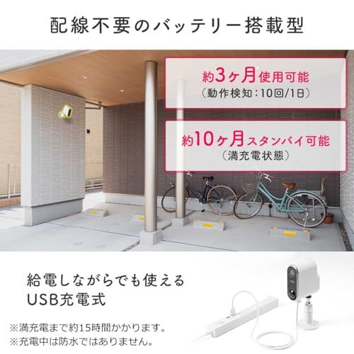 カメラにバッテリーを内蔵しており、外部電源に接続しない場合でも使用できます。バッテリーは一回の満充電で約10ヶ月のスタンバイ状態を保ちます。1日10回の動作検知で約3ヶ月使用できます。付属のUSBケーブルでカメラに給電しながらの使用も可能です。