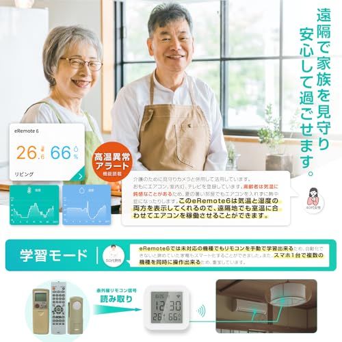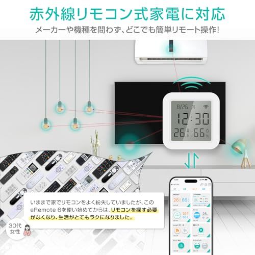 【温湿度・時刻を一目で確認できるわかりやすい画面表示】 大きくて見やすい液晶画面を搭載。「温度」「湿度」「時刻」「日付」を常に表示するため、室内環境をひと目で把握できます。スマホを開く必要がないため、忙しい朝やIoTに馴染みのない高齢者でも手軽に確認が可能です。また、eRemote6はインターネットを通して時刻を取得し、自動的に時刻校正を行うため機器の時刻ズレを心配する必要がありません。