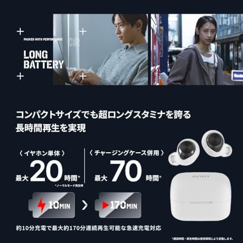 最大70時間再生&急速充電対応長時間使用でも安心:イヤホン単体で最大20時間、充電ケース併用で最大70時間の再生が可能。(*ノーマルモード再生時。 * 通話時間・再生時間は使用環境により変動します。)さらに、急速充電機能により10分の充電で約170分使用でき、忙しい日常にも最適です。