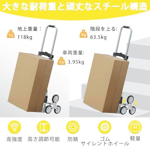 【重量118kg & 頑丈で耐久性に優れています】このキャスター付き階段昇降カートは、頑丈で厚みのあるアルミ合金フレームと厚さ20mmの鋼管スケルトンで作られており、耐久性、強度、耐老化性に優れています。118kgの耐荷重があり、引っ張ってもぐらつきません。ほとんどの家庭や商業施設のニーズに対応します。