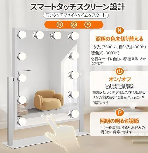 【三段階調色&無段階調光】ワンタッチでライトをオンオフし、電球色・白色光・自然光といった照明モードも簡単に切り替え可能です。朝や夜など暗い時間帯でも、気軽にメイクを楽しむことができます。無段階の色温度調整も可能で、タッチを続けることでお好みの明るさに自由に変更できます。