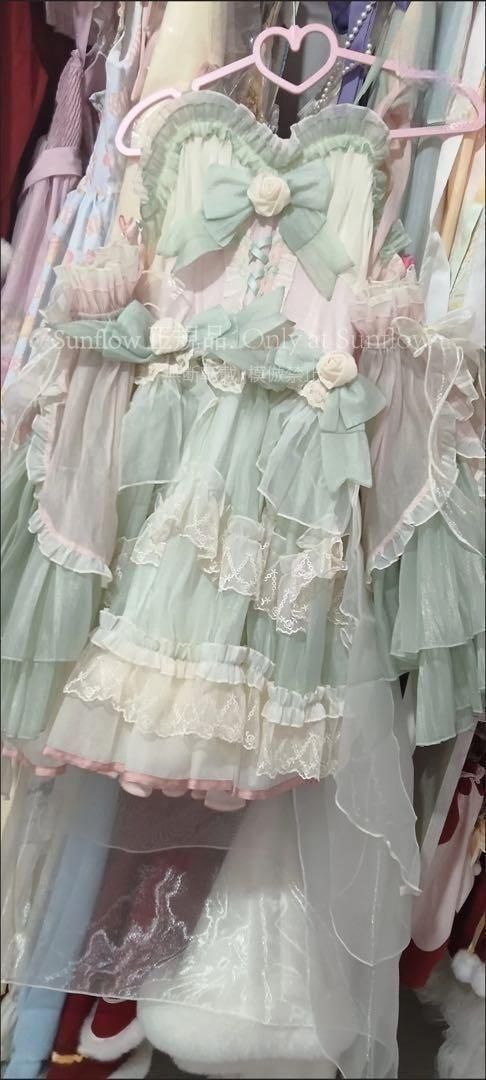 フリルとリボンが特徴のロリータドレス、ピンクとミントグリーンの優雅なデザイン。