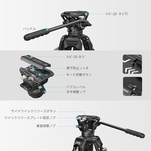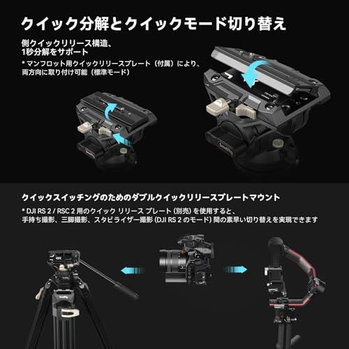 【二つクイックリリースプレート兼用】三脚のフルード雲台はDJI RS 2 / RS 3 / RS 3 Pro用とManfrotto用の2つのクイックリリースプレートモードをサポートします。2つのクイックリリースプレートを切り替えて使用することができます。1/4"-20と3/8-16 "のネジが付属しており、ビデオヘッドをほとんどのカメラと互換性があります。