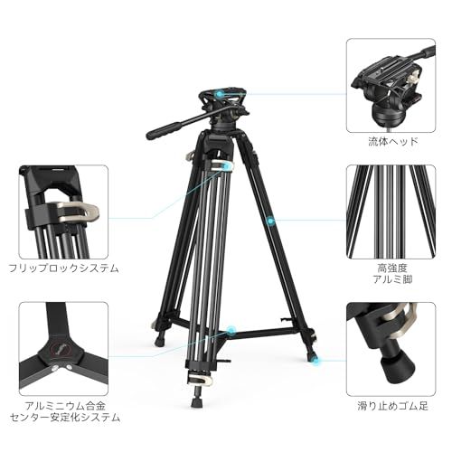 【携帯性と収納の利便性】三脚の広々としたキャリングハンドルと滑り止めデザインを特徴とするこのプロ仕様の三脚は、簡単な持ち運びと快適な移動を保証します。 さらに、クイックリリースプレートにはレンチが内蔵されており、便利に使用できます。 簡単に保管できるよう、三脚にはハンドバッグ付きの保管オプションが付属しています。