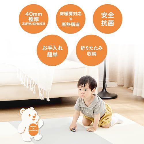 【安全・快適】厚さ4cmのクッションが優れた衝撃吸収力を発揮し、赤ちゃんの転倒時もしっかりとサポート。ハイハイやよちよち歩きの練習中も安心してご使用いただけます。程よい柔らかさで膝や手首への負担を軽減し、快適な遊び空間を実現。5層構造のしっかりとしたつくりで、毎日素肌で触れるマットでも安心。汚れにも強く、お手入れ簡単で衛生面も満点。