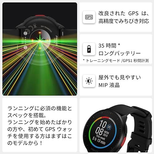主な機能:手首型心拍計測、GPS(みちびき対応)、オート/マニュアル ラップ計測、ランニング/ウォーキングテスト、三大栄養素別で消費エネルギーを表示、栄養補給リマインダー、活動量計測(歩数・距離・消費カロリー等)、睡眠・自律神経計測、スマート通知(着信・通知)、音楽コントロール、天気予報、 耐水50WR