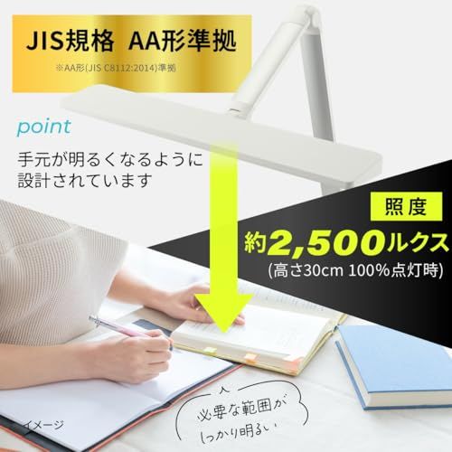 【 特 長 】 直接目に光があたらない構造 手元が明るくなるように設計 JIS規格 AA形準拠 USB Type-C/USB Type-A搭載 彩りあざやか Ra93 広く照らせる横幅35cmセード タッチ式3段階調光 角度調整できる 全光束 約1200ルーメン カラーはホワイト