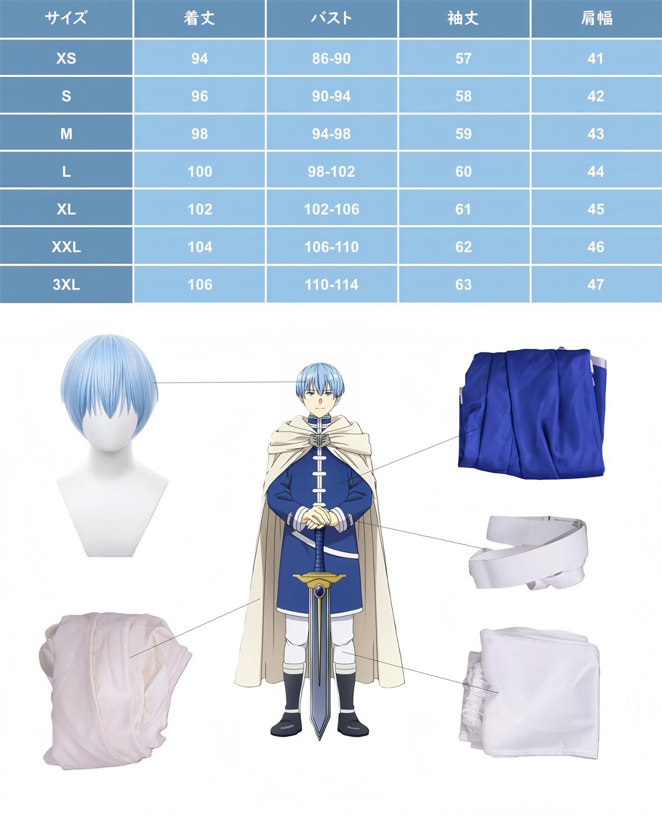 ★【ヒンメル コスプレ衣装】:「葬送のフリーレン」から飛び出したかのような、ヒンメルの勇者衣装とウィッグのセットです。青い武術家の衣装と白い斗篷が、彼の壮麗な若き姿を忠実に再現。高品質な素材を使用し、細部までこだわったデザインが特徴です。さらに、ヒンメルの象徴的な青い短髪を再現したウィッグもセットに含まれています。アニメの世界そのままのヒンメルの風格を、手軽に楽しむことができます。