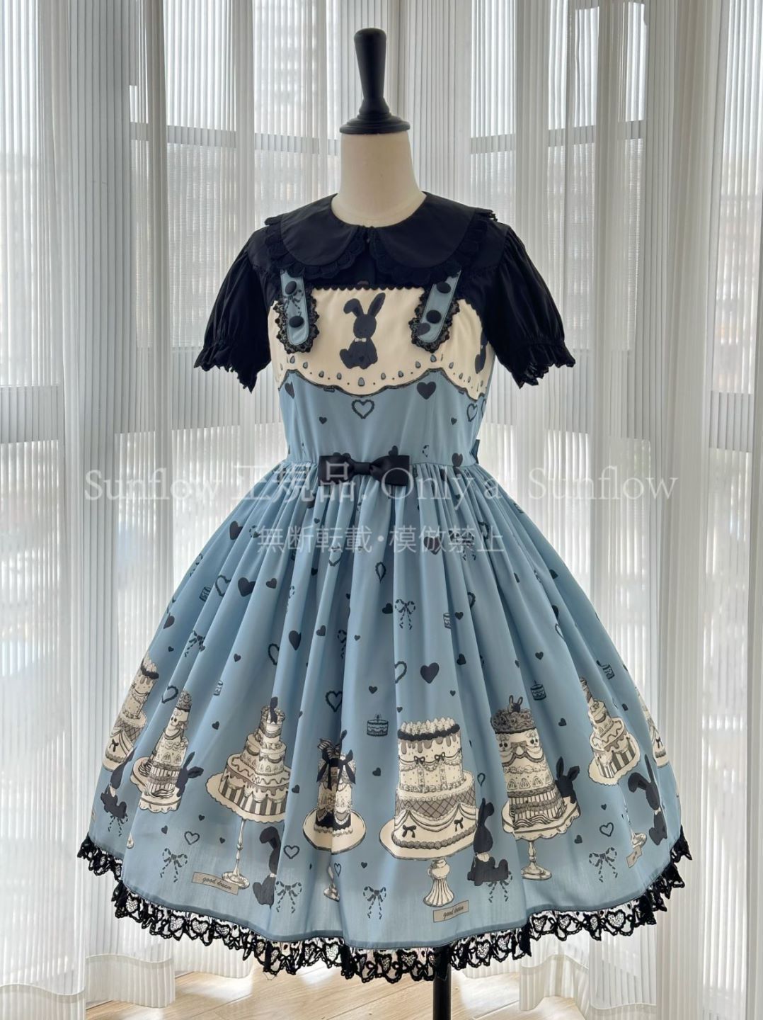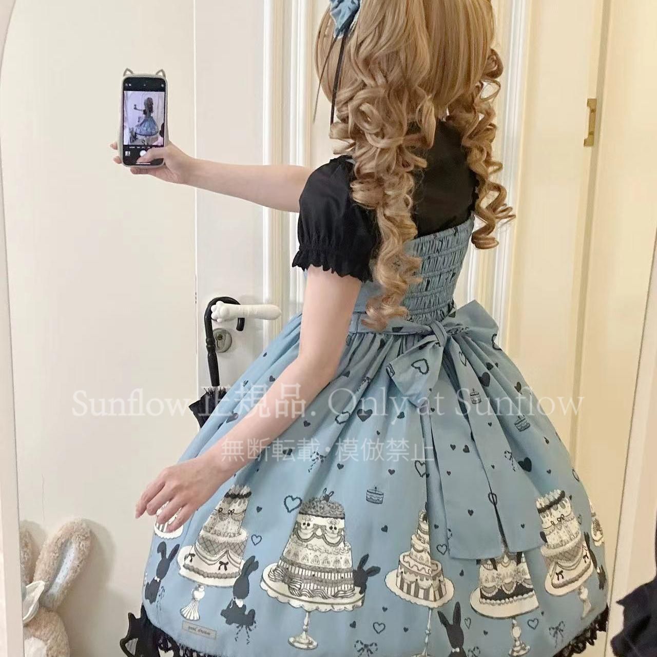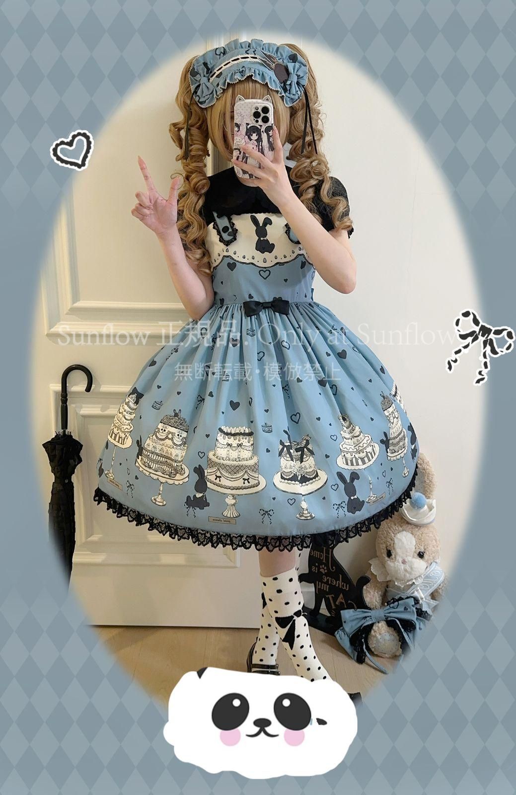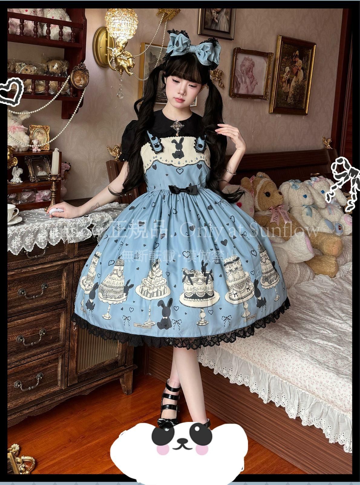 デザイン: 可愛らしいケーキとうさぎのプリントが目を引く甘ロリドレス。
