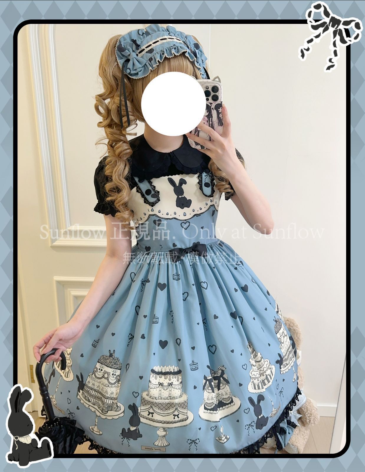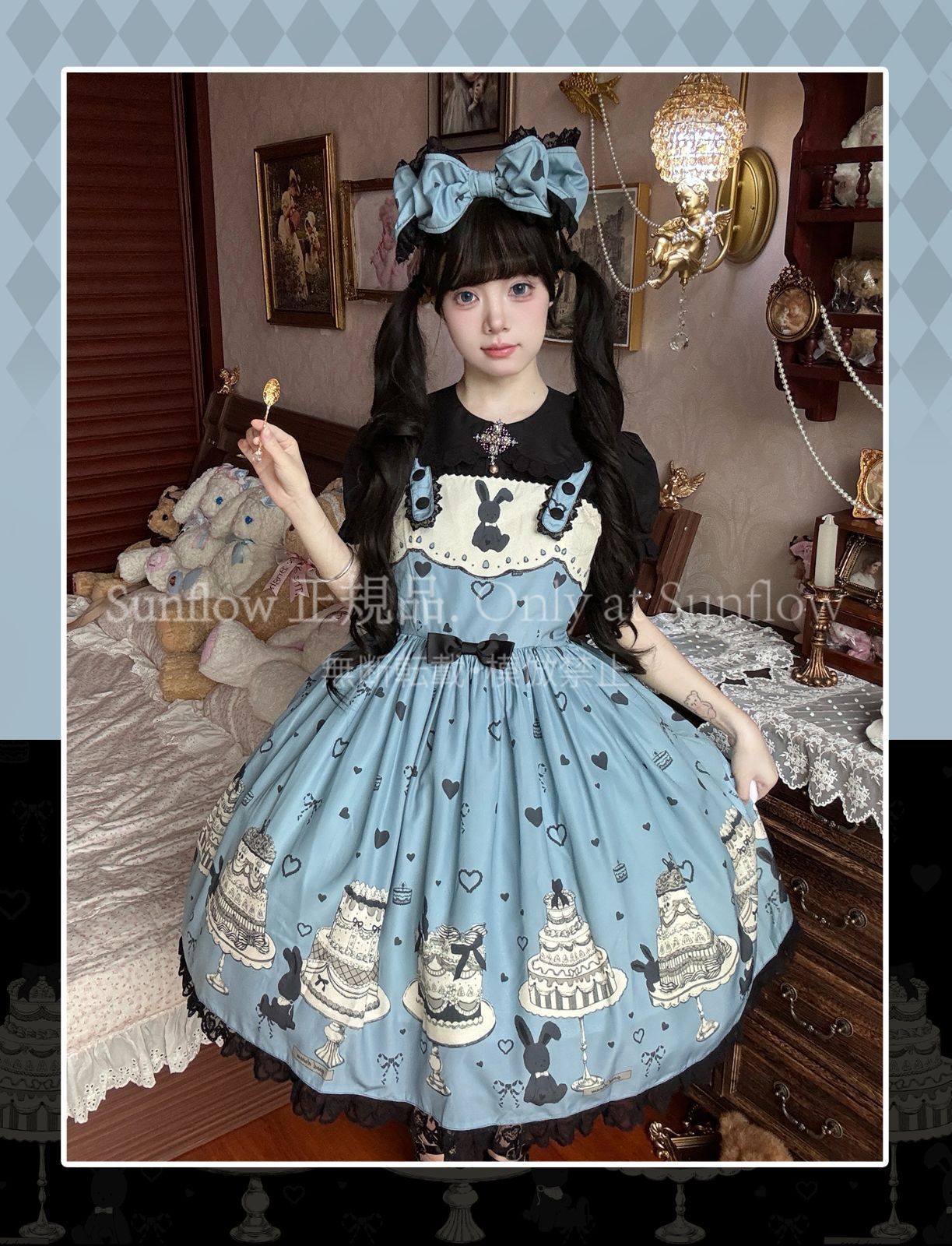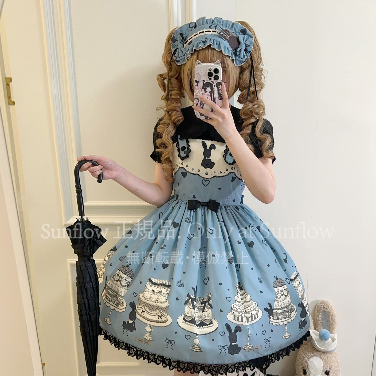 デザイン: 可愛らしいケーキとうさぎのプリントが目を引く甘ロリドレス。