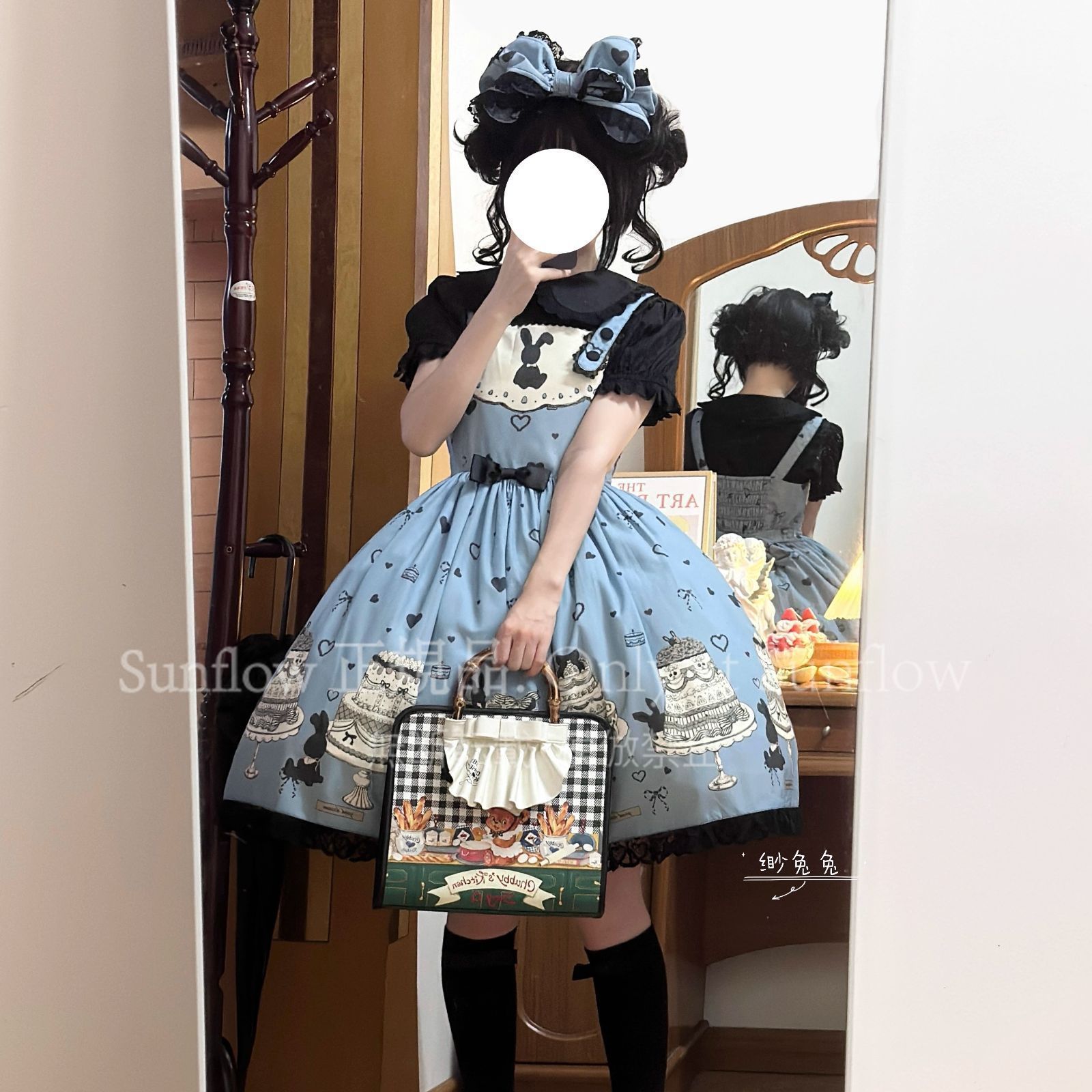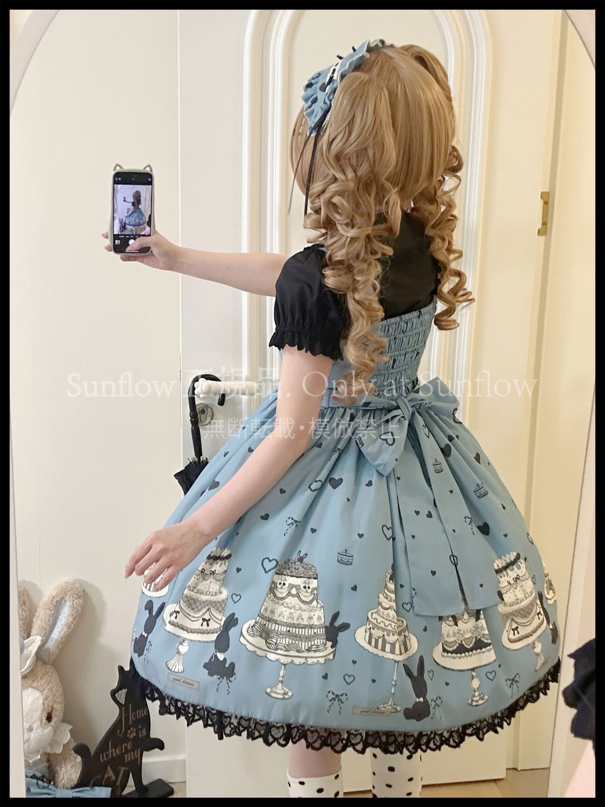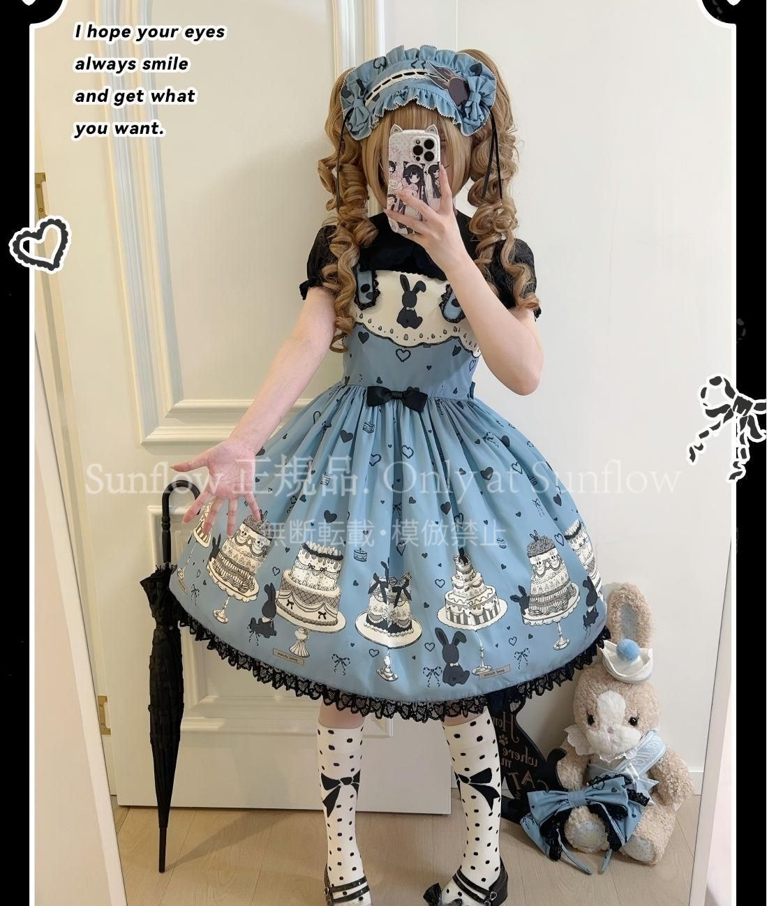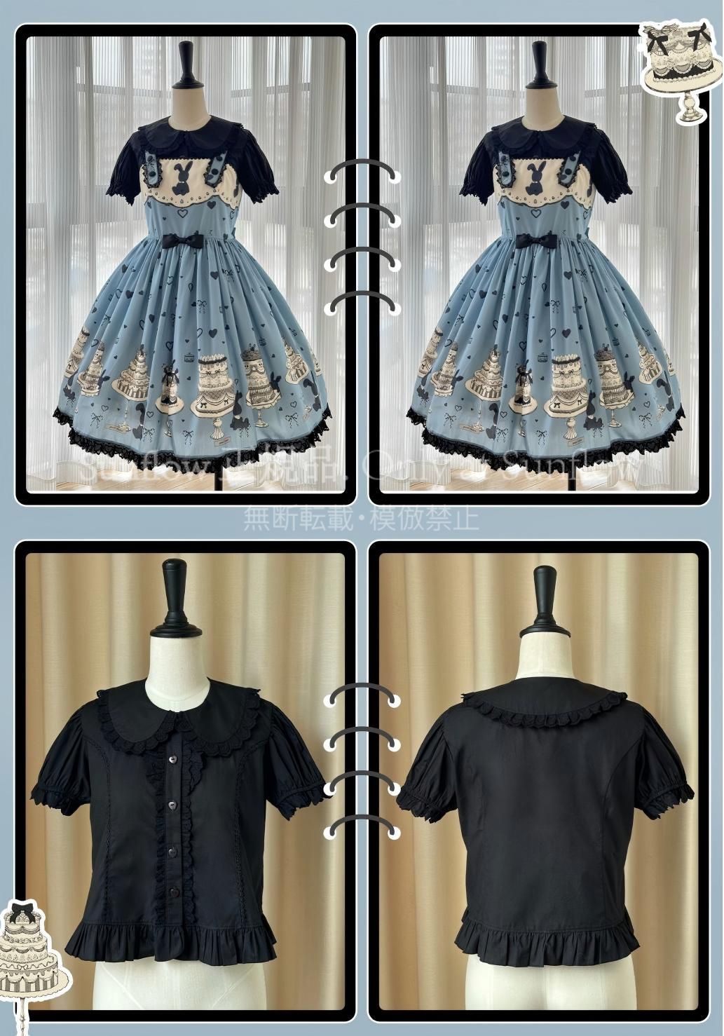 デザイン: 可愛らしいケーキとうさぎのプリントが目を引く甘ロリドレス。