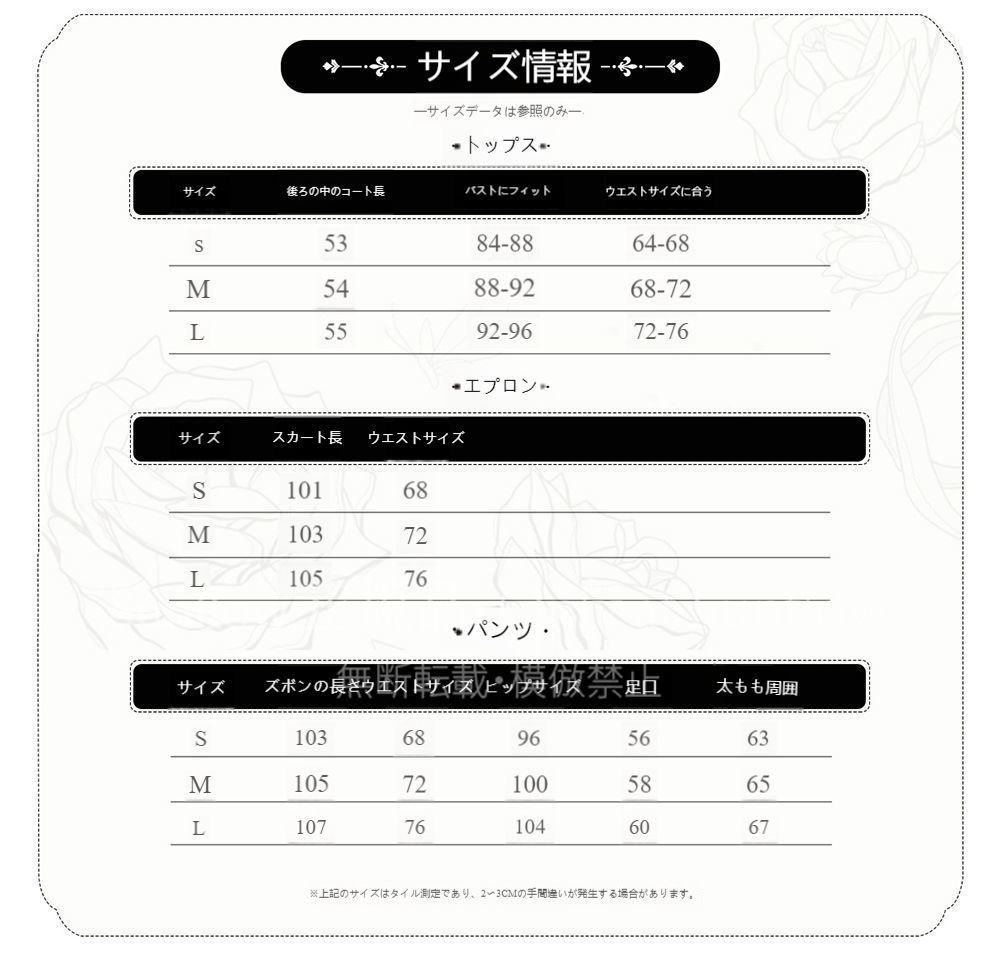 Sサイズ: 後中着丈53cm、適応バスト84-88cm、適応ウエスト64-68cm