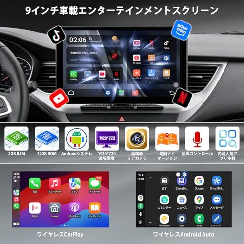 9インチディスプレイオーディオ 2GB RAM+32GB ROM YouTube|Netflix|TikTok等アプリに対応し 1920×720高精細解像度 ワイヤレス接続に対応してCarPlay|アンドロイドナビと互換性がありま e9174429