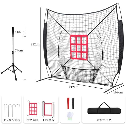 【仕様】【セット内容】バッティングネット(展開サイズ:約212cm*212cm*107cm)、バッティングティー(高さ:78cm-116cm可調節)、固定用釘*4、セット収納サイズ(約114cm*15cm*16cm)