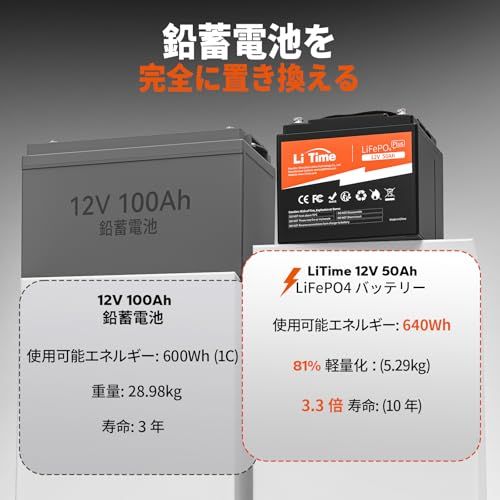 【100%DODで640Whエネルギー量&5倍速く充電】当社の12V50Ah LiFePO4バッテリーは放電深度(DOD)100%を実現して640Whのエネルギー(12.8V50Ah100%DOD640Wh)で、12V100Ah鉛酸バッテリーの放電深度(DOD)が約50%であるため(12V100Ah50%DOD600Wh)、LiTimeの12V50Ah バッテリーの方は使用可能のエネルギー量が多いです。これで、12V100Ah鉛蓄電池が80Wの負荷を7.5時間連続で動作できるが、当社の12V50Ahリチウムイオンバッテリーが8時間連続使用可能です。また、100Ahの鉛蓄電池をフル充電するには1020時間かかりますが、リン酸鉄バッテリーは12.5時間しかかかりませんので必要な電力をより早く使用できます。
