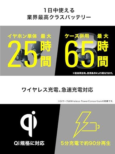 1日中使える、業界最高クラスバッテリー:ノイズキャンセリングOFF時では、イヤホンだけで最大25時間の連続再生が可能なため、 電池切れを心配することなく音楽や動画やSNSを1日中楽しむことができます。また、ノイズキャンセリングON時でも最大15時間、充電ケースを併用すれば最大65時間の連続再生が可能です。