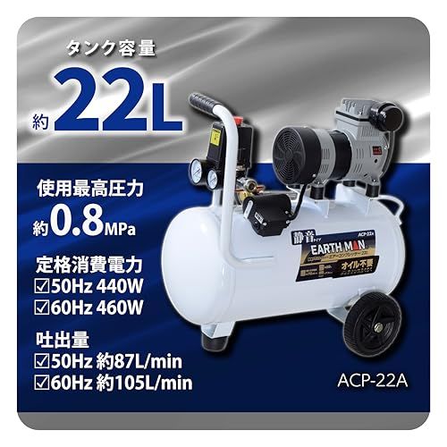 高儀 Takagi EARTH MAN 空気入れ 吹き飛ばし エアーコンプレッサー オイルレス 静音タイプ 静かな作動音 オイル不要 メンテナンス 簡単 キャスター付き ACP-22A 彡