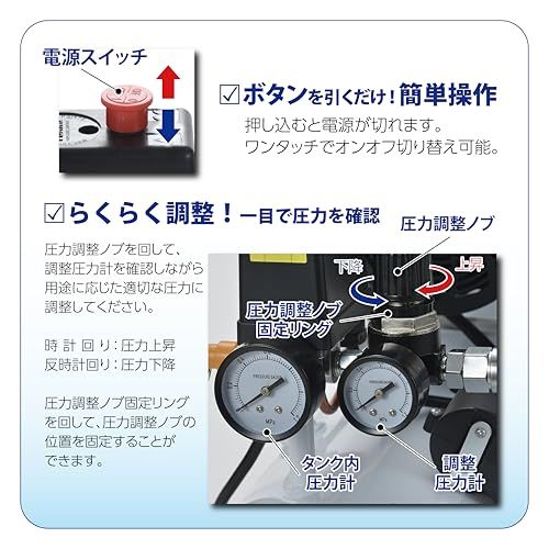 使用最高圧力:約0.8MPa(8.2kgf/cm2)、安全弁設定圧力:約0.88MPa(9.0kgf/cm2)、リリース起動圧力:約0.5MPa(5.1kgf/cm2)、吐出圧力設定範囲:約00.8MPa(08.2kgf/cm2)、充填時間:50Hz 約5分・60Hz 約4.5分、接続(吐出)口:ワンタッチソケット1/4、タンク容量:約22L、騒音値:約70dB/m