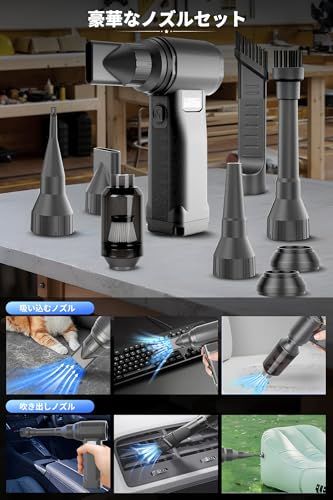 【吸引&噴射2in1設計・ノズル9種類付】 小型ブロワーは吸引と噴射の2WAY設計で「エアダスター&ハンディー掃除機兼用」、従来の電動エアダスターより幅広いシーンで活用可能です。吹き飛ぶモードと吸い込みモードによって、9種類ノズルを属して、場所に合わせて使い分けすることができます。「?ブラシノズル:付着した汚れを吹き落としながら清掃できます ?長ノズル:先端が細く、正確に吹き飛ばすことがでます ?細いノズル:浮き輪などの空気入れに便利 ?長扁口&短扁口:狭い場所の清掃に使用できます。?ダストカップ:掃除時にゴミを集める。?接続部品*2:吹き出し口と吸い込み口をよりよく接続して使用します。」