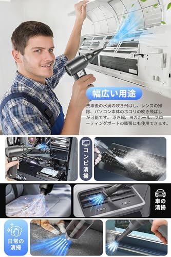 【吸引&噴射2in1設計・ノズル9種類付】 小型ブロワーは吸引と噴射の2WAY設計で「エアダスター&ハンディー掃除機兼用」、従来の電動エアダスターより幅広いシーンで活用可能です。吹き飛ぶモードと吸い込みモードによって、9種類ノズルを属して、場所に合わせて使い分けすることができます。「?ブラシノズル:付着した汚れを吹き落としながら清掃できます ?長ノズル:先端が細く、正確に吹き飛ばすことがでます ?細いノズル:浮き輪などの空気入れに便利 ?長扁口&短扁口:狭い場所の清掃に使用できます。?ダストカップ:掃除時にゴミを集める。?接続部品*2:吹き出し口と吸い込み口をよりよく接続して使用します。」