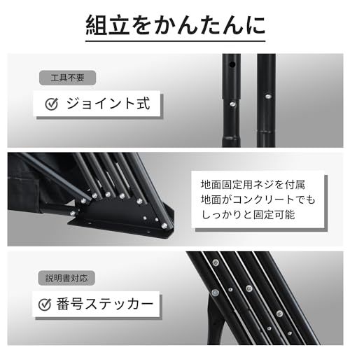 【簡単組立】パイプのつなぎ目がジョイント式になっているから、工具不要で完成できます。それぞれ部品ごとに目印のシールやステッカーが付いているから部品選びで間違える心配ありません。また、固定用のネジも付属しており、必要に応じて地面に穴を開けて固定することができます。