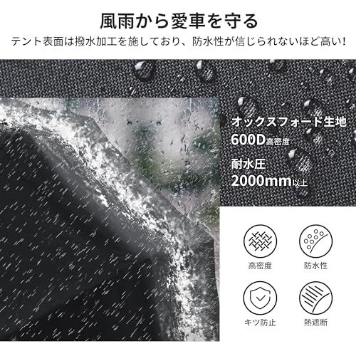 【日差しや風雨から愛車を守る】ガレージの布は600D高密度オックスフォード生地を採用!紫外線や熱を遮断し、大切な愛車の劣化や色あせを防ぎます。テント表面は撥水加工を施しており、防水性が信じられないほど高い!2000mm以上の耐水圧で雨水侵入を完全に防ぎます。